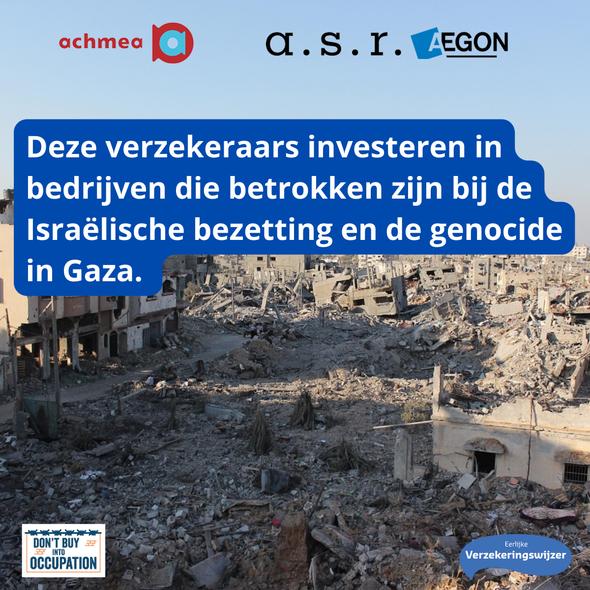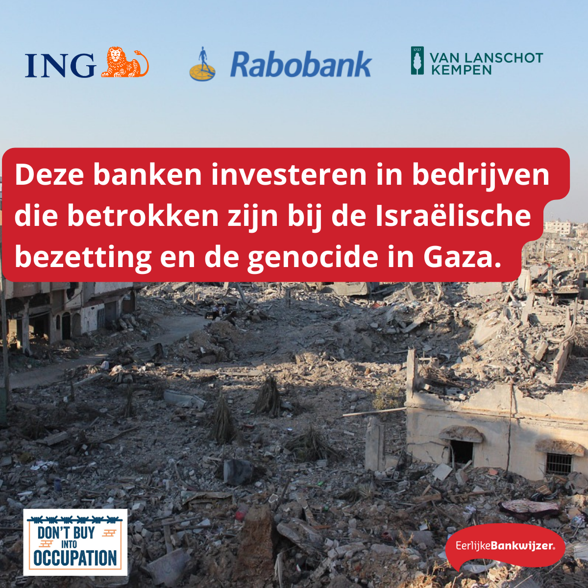 Nederlandse banken, verzekeraars en pensioenfondsen investeren in bedrijven die betrokken zijn bij de Israëlische bezetting en de genocide in Gaza.