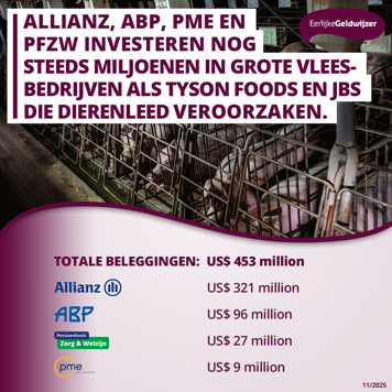 Allianz, ABP, PfZW en PME doen te weinig om het dierenwelzijn bij vleesbedrijven te verbeteren. De financiële instellingen beleggen gezamenlijk 453 miljoen dollar in vleesbedrijven die in verband worden gebracht met ernstige misstanden op het gebied van dierenwelzijn. Geen enkele partij scoort hoger dan drie van de tien punten op dierenwelzijnsbeleid en de toepassing daarvan. Dat blijkt uit onderzoek van de Eerlijke Geldwijzer, uitgevoerd door Profundo.
